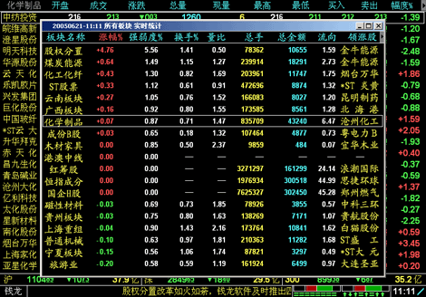 板块分析:提供各个板块的实时统计信息,包括强弱度、领涨股、换手、量比、领涨股等,有助于把握盘中的板块动向。