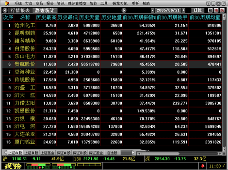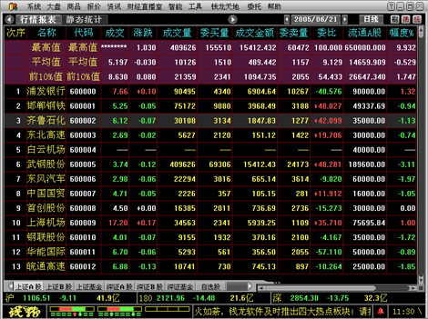 除了金典版以外,钱龙还与众不同地拥有第二款客户端分析软件——旗舰版。旗舰版具有时尚的界面,除了具有与金典版同样出色的实时分析功能以外,还集成了强弱分析、区间分析、指标排行、财务分析等专业分析功能,尤其是智能报表中各种统计、筛选、数据导出功能,是专业咨询师进行分析并提交报告的优秀工具。
