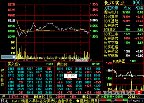 连续按“+”键,或者按“板”标签,可以在右侧显示当前股票的关联股票,并且将其最新成交价、涨跌幅度和实时走势尽收眼底。
