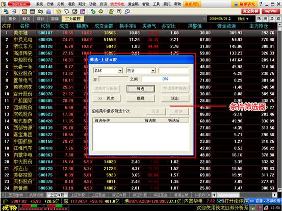 为方便用户选股,钱龙黄金眼可以按不同的操作风格设置股票筛选条件,满足用户的需求。
